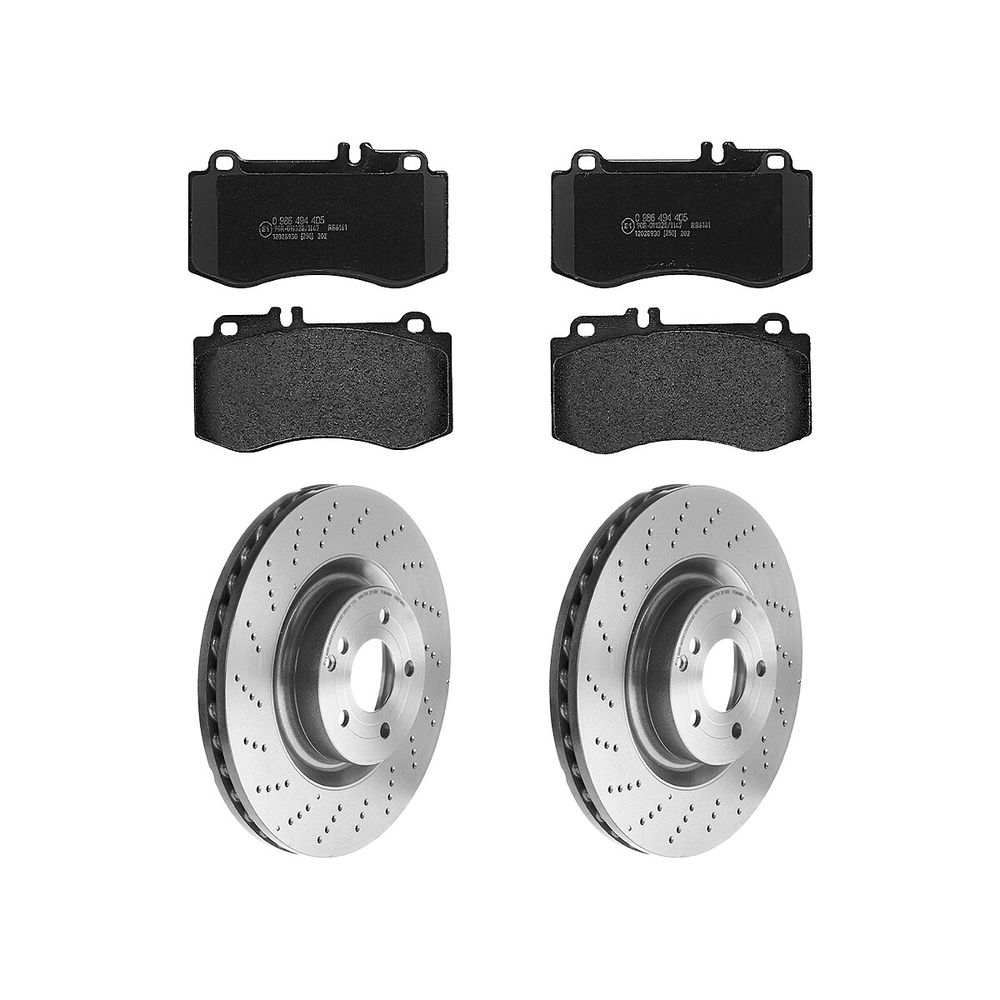 KIT DE 2 DISCOS VENTILADOS Y 1 JUEGO DE BALATAS BAJOS METALES COMPATIBLES CON MERCEDES-BENZ E500 DE 2009 A 2017 BREMBO®