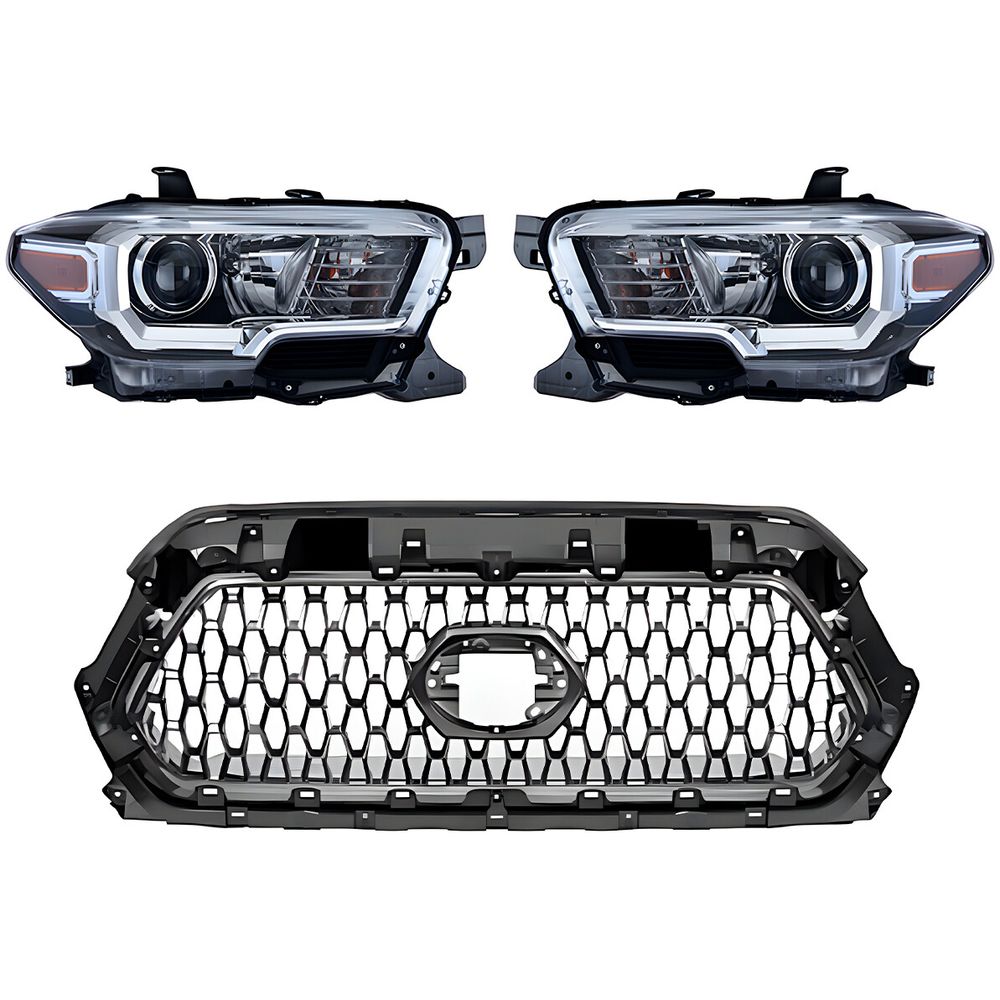 KIT DE 2 FAROS DEPO® Y 1 PARRILLA TONG YANG® COMPATIBLES CON TOYOTA TACOMA DE 2018 A 2019
