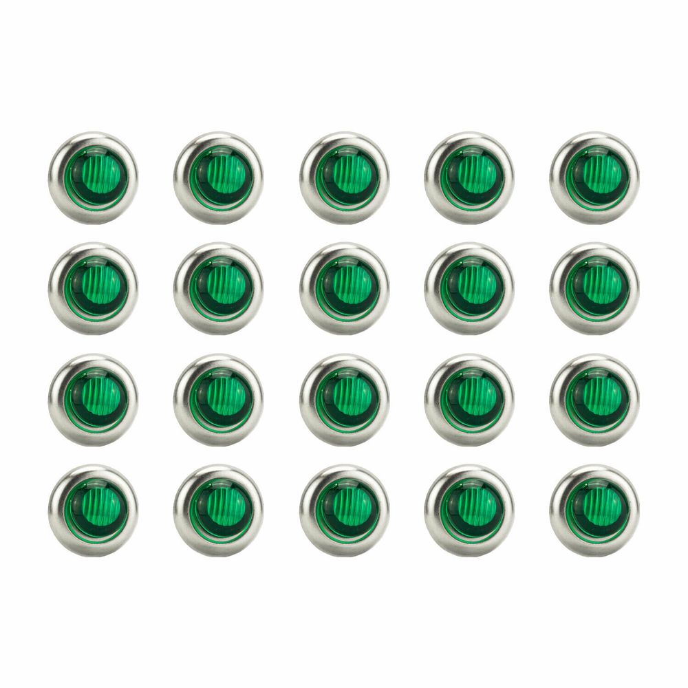 Conduce de noche con absoluta seguridad adquiriendo este JUEGO que incluye 20 PIEZAS de PLAFONES TIPO BOTÓN CON BISEL TUNELIGHT® de 2 LEDS color VERDE y acabado CROMADO de máxima calidad, capaces de iluminar los caminos más difíciles con su excelente potencia. Su patrón de luz complementa el alumbrado de todo vehículo. Ideales para tráileres, remolques, grúas, excavadoras, montacargas, tractores, etc.